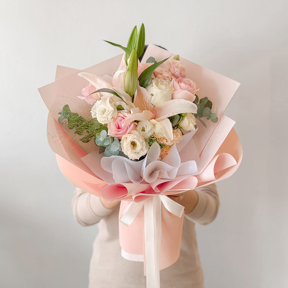 Flora Type & Color : (depend avaibility) Roses , Eustoma , Carnation , Lily ,PingPong Lily may arrived as closed buds that develop to full bloom within 3 days. Alternative materials may be used to ensure timely delivery.